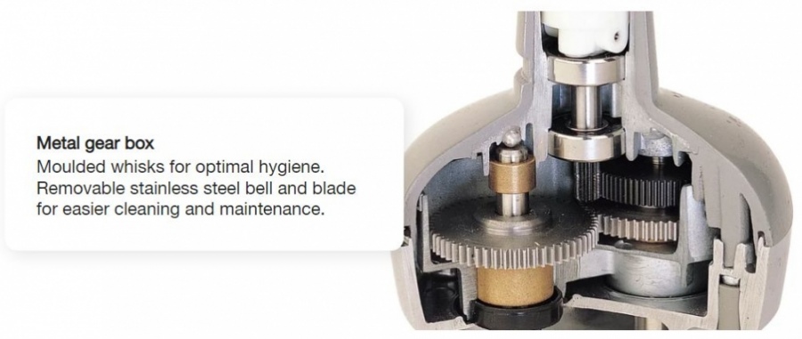 - Moulded whisks for optimal hygiene. Removable stainless steel bell and blade for easier cleaning and maintenance.