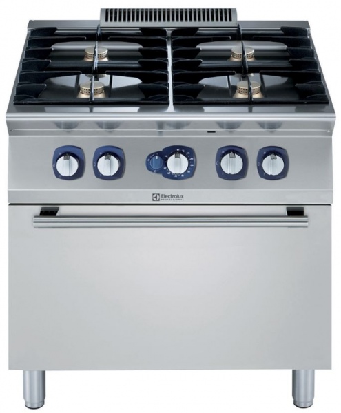 - Base compartment consists of a gas heated standard oven with stainless steel burners and self stabilizing flame positioned beneath the base plate.