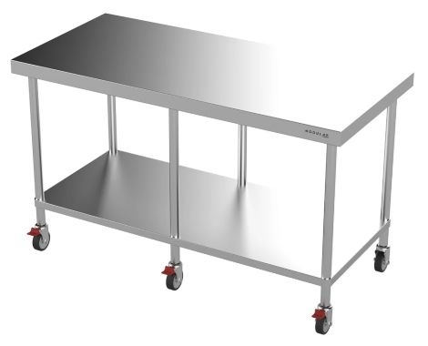 - Robust 304 grade stainless steel top (1.2mm) with galvanised steel reinforced backing (2mm)Stainless steel tube legs (Ø38mm) with Ø100mm stainless steel castors (with swivel lock and brakes to half)